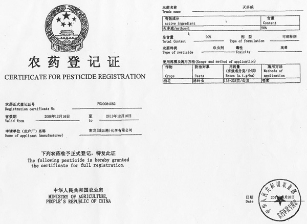 南龍90%滅多威粉劑農(nóng)藥登記證