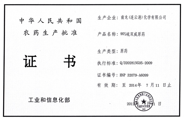 硫雙威原藥生產(chǎn)批準(zhǔn)證書